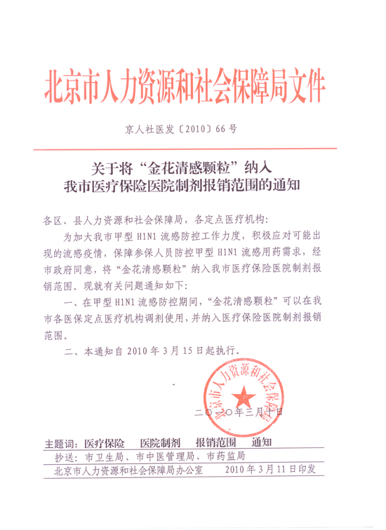 北京社会保障局:“金花清感颗粒”纳入我市医疗保险医院制剂报销范围 [2010.03.12]